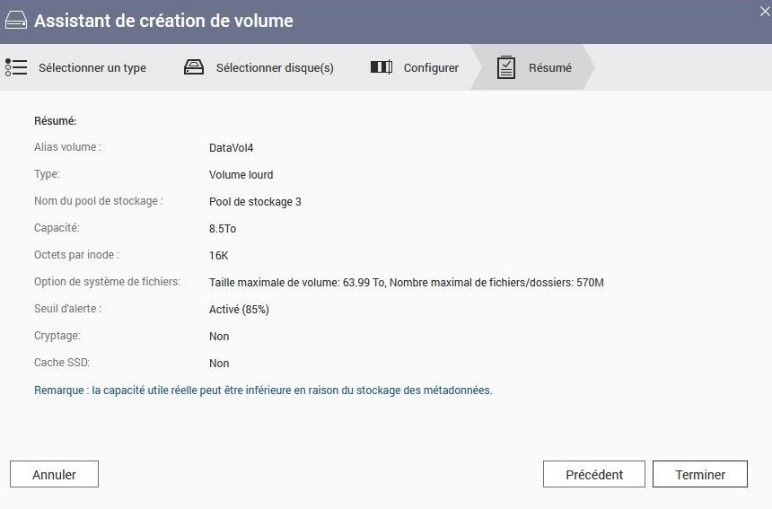 L’assistant suivant vous demande la taille du volume et les octets par inodes. Plus les octets sont gros, plus c’est rapide, mais plus il y a de place perdue pour de petits fichiers. J’ai suivi une conférence d’optimisation en ligne avec Qnap, et un des meilleurs rapport est 16 Koctets.