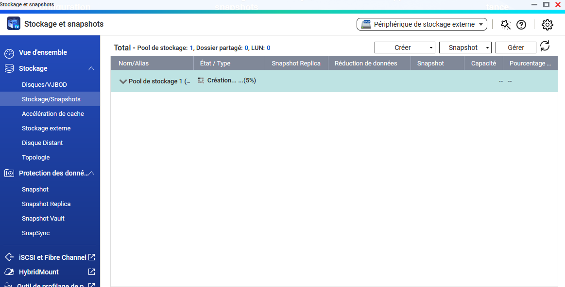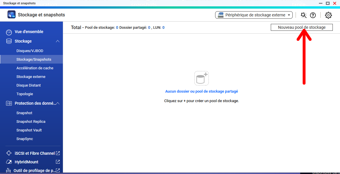 Mais revenons à nos moutons en choisissant, après la première connexion utilisateur et après quelques pages d’explications la page stockage & snapshots, pools de stockage.
