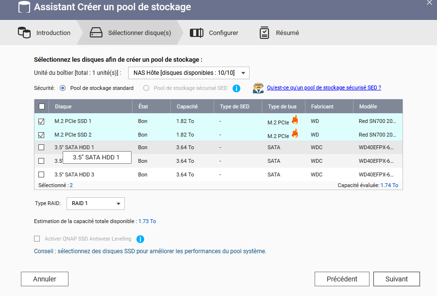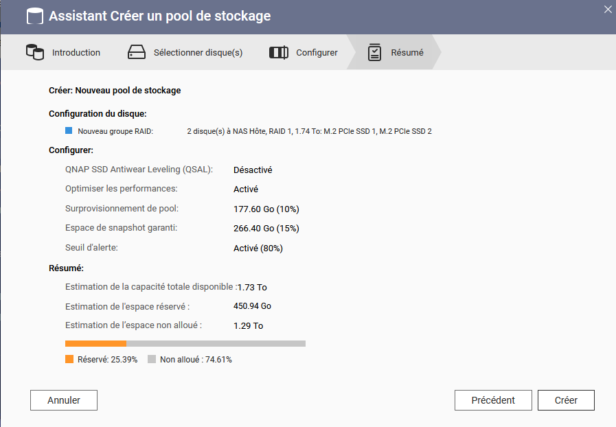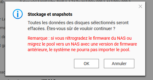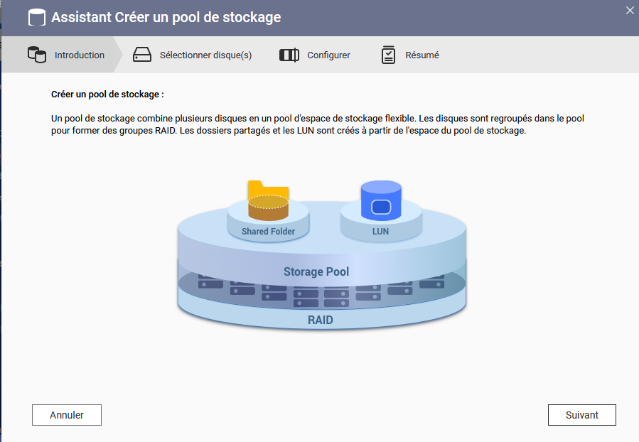 L’assistant vous montre que le pool concerne la partie fonctionnement raid de vos disques, sur laquelle vous pourrez ensuite créer vos espaces de stockage (dossiers partagés).