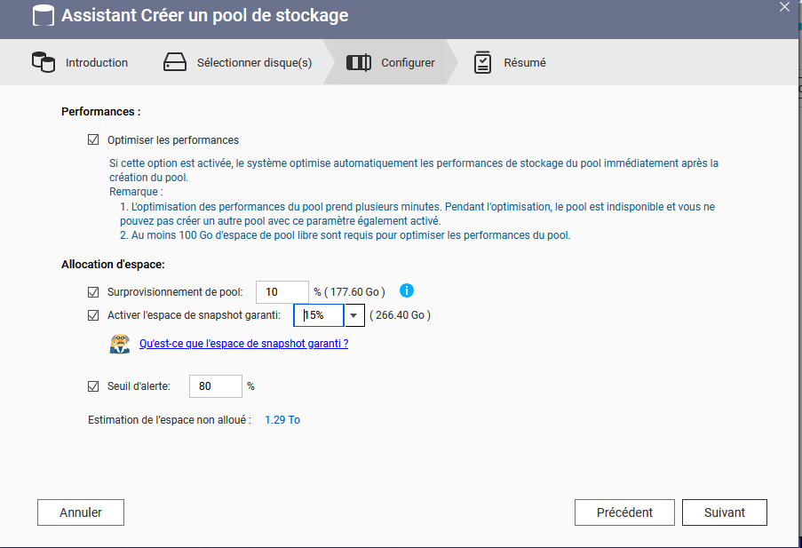 Il faut ensuite choisir et préciser les paramètres. Dans ce cadre, il y a fort à discuter, mais considérant que je dispose de 2To utiles pour le système (et du futur dossier partagé des machines virtuelles), je pense que je peux "sacrifier" à peu près le quart de l’espace disponible à l’optimisation (surprovisionnement de pool) et à la sécurité (snapshots).