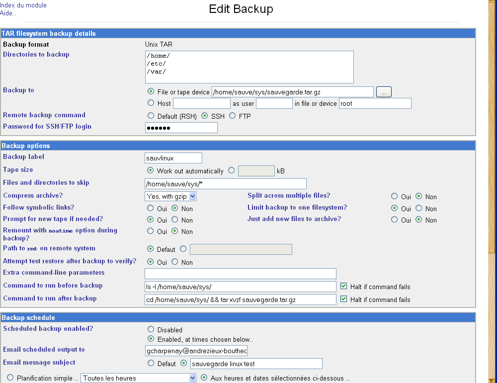 Dans la page ci-dessus, bien ajouter le slash (/), après les noms de répertoires à sauvegarder, zone directories to backup (car il s’agit bien de répertoires et nom de fichiers).