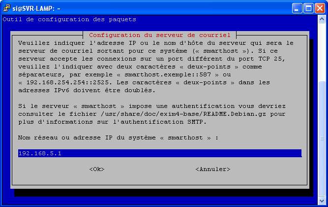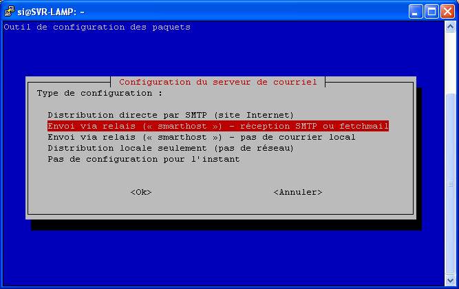Choisir comme type de configuration Envoi via relais (« smarthost ») - réception SMTP ou fetchmail
