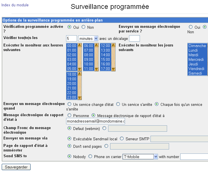 Bouton "surveillance programmée", paramétrer la page selon vos souhaits, notamment le champ "champ from : du message électronique, par une adresse email valide et valider.