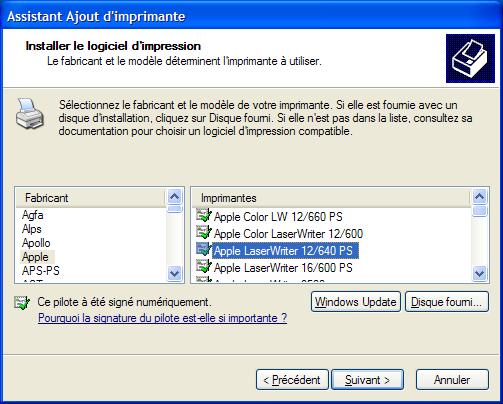 Maintenant Windows vous demande de séléctionner le driver de l’imprimante, sélectionnez alors "Apple LaserWrite 12/640 PS".