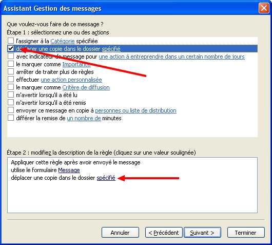7. activer la case à cocher « déplace une copie vers le dossier spécifié »