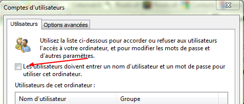 La fenêtre des comptes utilisateurs apparait et il suffit de décocher l’option "les utilisateurs doivent entrer un nom d’utilisateur et un mot de passe pour utiliser cet ordinateur.