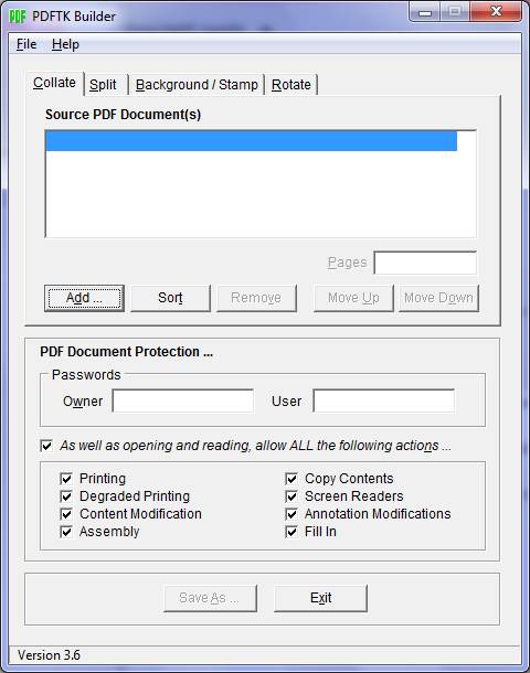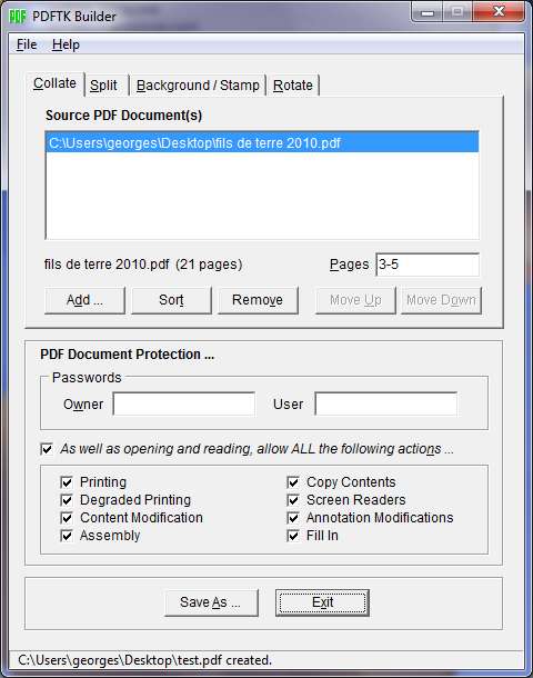 Une fois installé il suffit d’ajouter les pdf avec le bouton add, choisir les options d’utilisation du pdf qui sera généré et lancer la génération finale avec le bouton "save as".