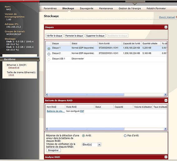 Dans l’onglet systeme, stockage, vous retrouverez vos disques sur la batterie raid, mais en erreur... et pas de possibilité de créer une baie raid. Gasp !