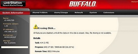 Attention ! Soyez patient, la mise à jour nécessite un certain temps, environ 5 à 10 mn, et attendez bien le message d’écran disant que la mise à jour s’est terminée. N’éteignez ou ne redémarrez surtout pas manuellement le buffalo pendant cette mise à jour car elle altérerait les données installés et bonjour les dégâts ! Si tout se passe mal ou si vous perdez votre buffalo, vous pouvez aller ici.