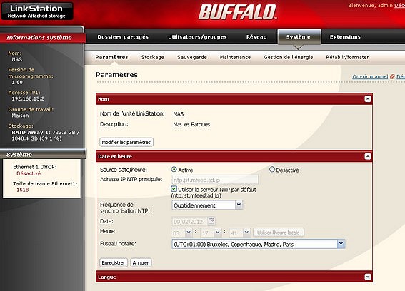 NTPNASBUFFALOIl est très important, sinon primordial de bien régler l’heure du NAS, sinon, et notamment si vous faites arriver dessus des sauvegardes incrémentielles (ou des synchronisations de dossiers), vous pourriez être confrontés à de petits ennuis.
