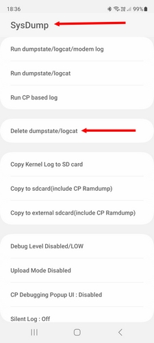 Sélectionnez le menu "SysDump", puis le sous-menu "deleteDumpstate/Logcat" et le tour est joué.