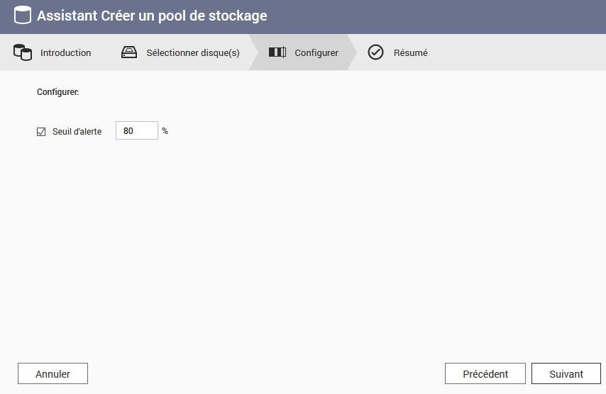 Juste avant la création, définissez le seuil d’alerte d’occupation du pool de stockage. Sachez que vous pourrez modifier ou supprimer ultérieurement ces alertes d’occupation de pool de stockage. Personnellement, je préfère mettre des alertes sur les volumes qui occupent les pools de stockage plutôt que sur les pools de stockage eux-même car j’utilise des volumes lourds (thick volumes). Dans le cas de volumes légers (thin volumes), il vaut mieux effectivement mettre une alerte au pool de stockage. Mais laissons la à 80 %, pour l’exemple.
