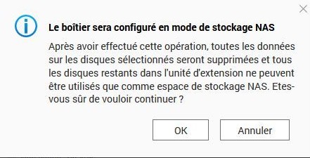 Il vous précise aussi que le mode de stockage sera le mode de stockage NAS, c’est à dire que votre qnap central "verra" cette baie de disque comme une baie de disques internes et qu’en cas de reboot par exemple, il remontera automatiquement ces volumes.