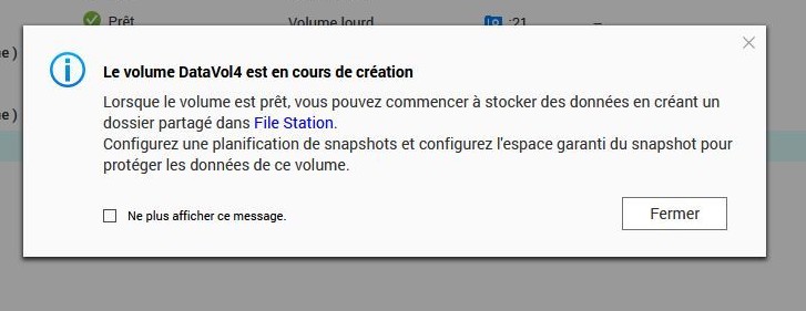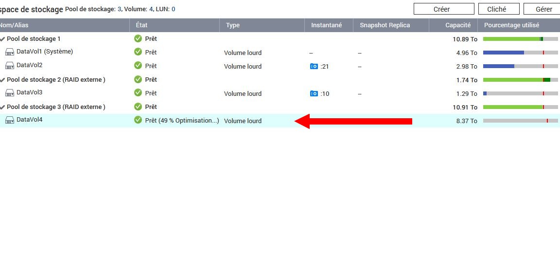 Enfin, une fois terminé, il y a un petit temps d’optimisation. Mais en principe, vous pouvez aller créer vos dossiers partagés sur le nouveau volume (ici datavol4).