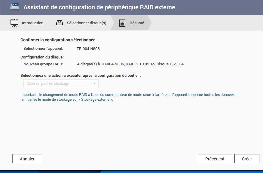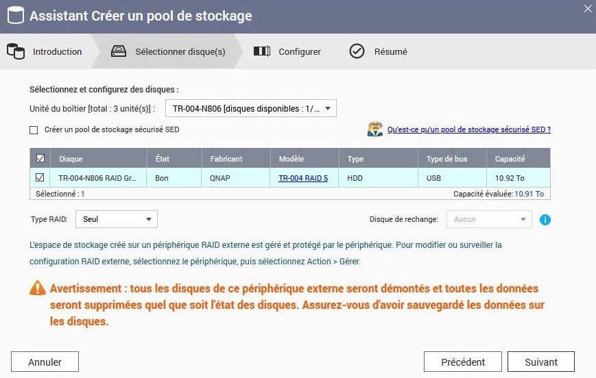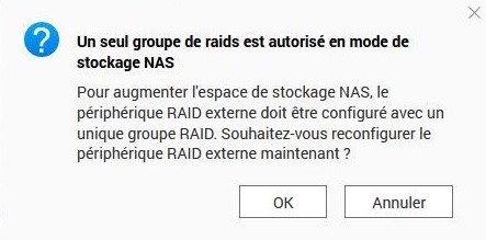 Nous retrouvons nos disques et notre TR004 et le système précise que cette unité externe TR004 ne peut contenir qu’un type de raid. Donc OK.