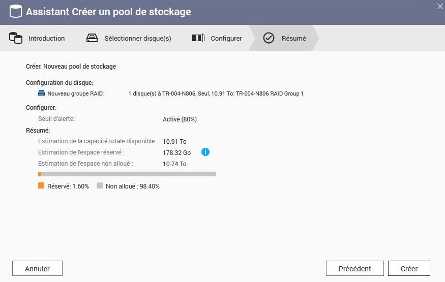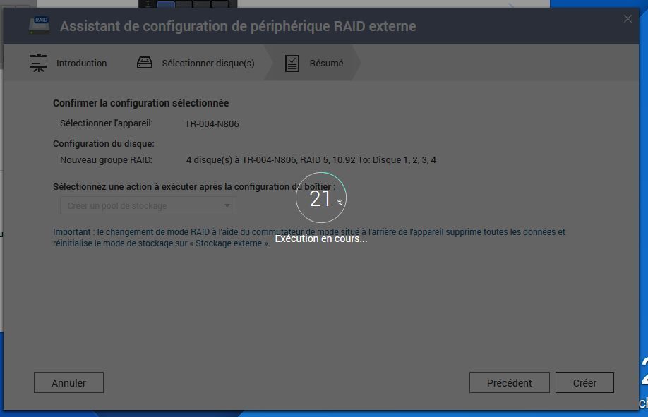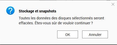 On peut s’interroger sur cet avertissement redondant sur celui de la création du raid, mais il ne faut pas oublier que vous pouvez redéfinir et recréer un pool de stockage sans redéfinir la prise en charge du raid. Donc avertissement utile.