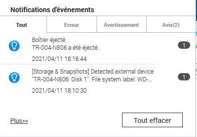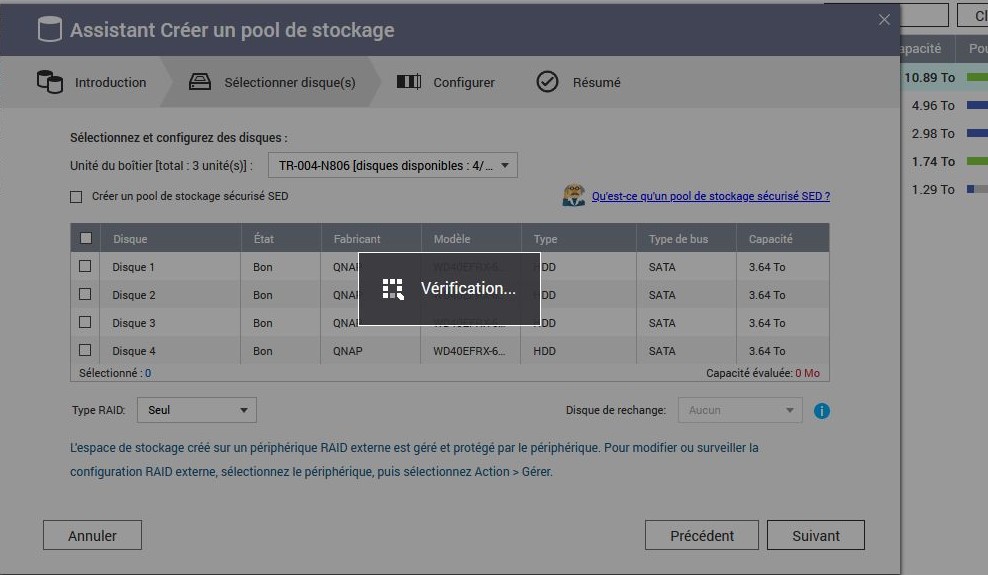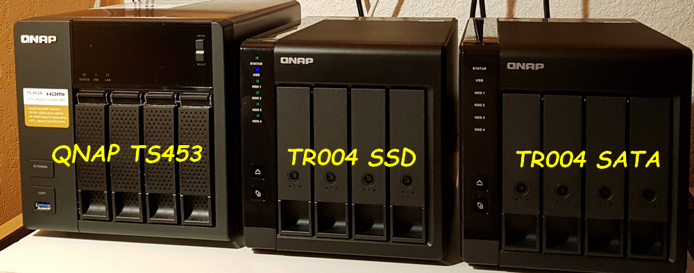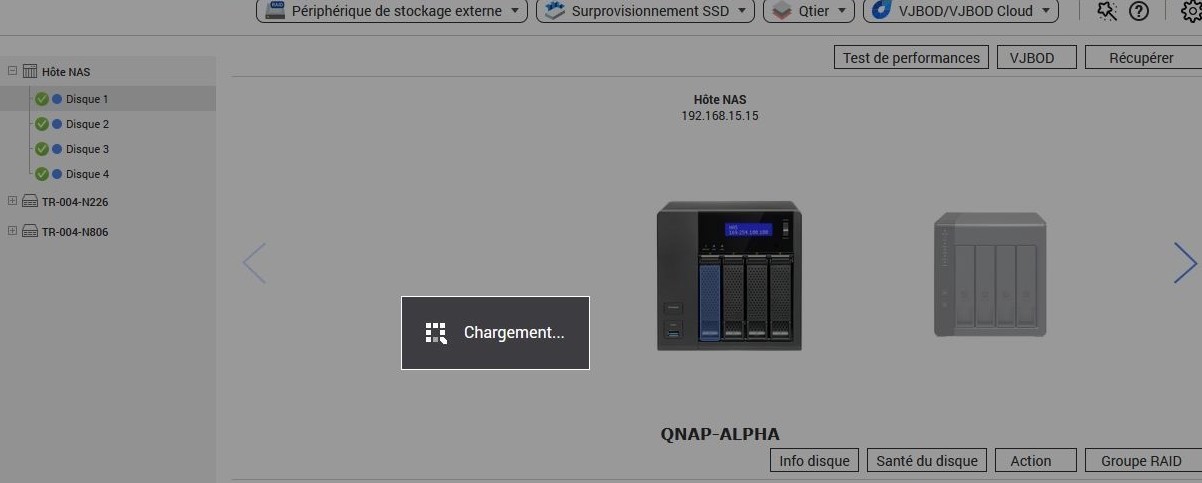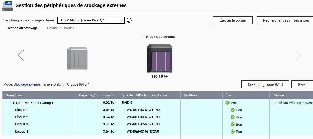 RAIDDISQUES DURSQNAPSTOCKAGENASJ’ai complété un Qnap TS453 avec deux baies de disques disposées sur des supports externes, des QNAP-TR004.