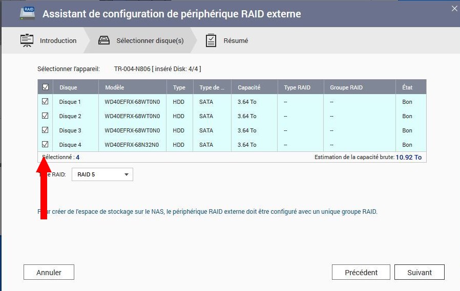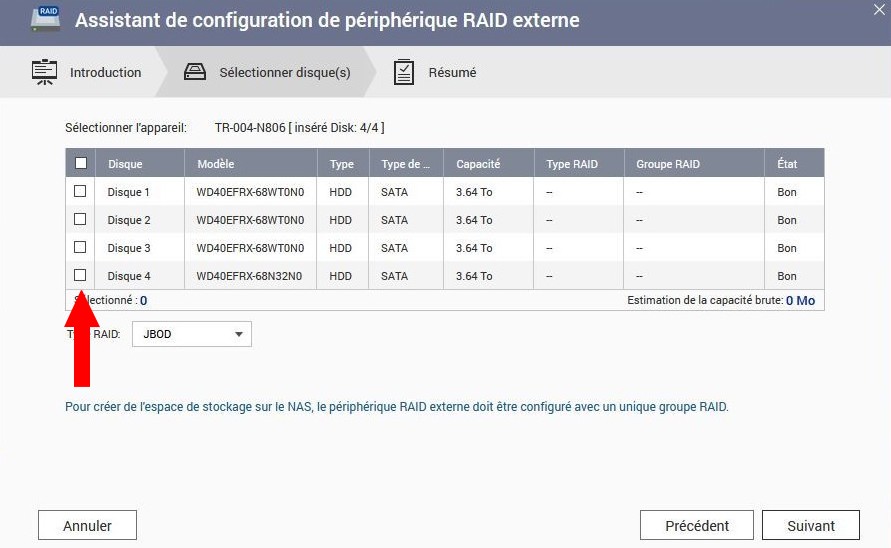 Choisissez les disques du raid (cochez les disques à gauche). Dans ce cas de TR004 et vu que la carte mère du TR004 ne peut gérer qu’un seul raid, TOUS les disques.