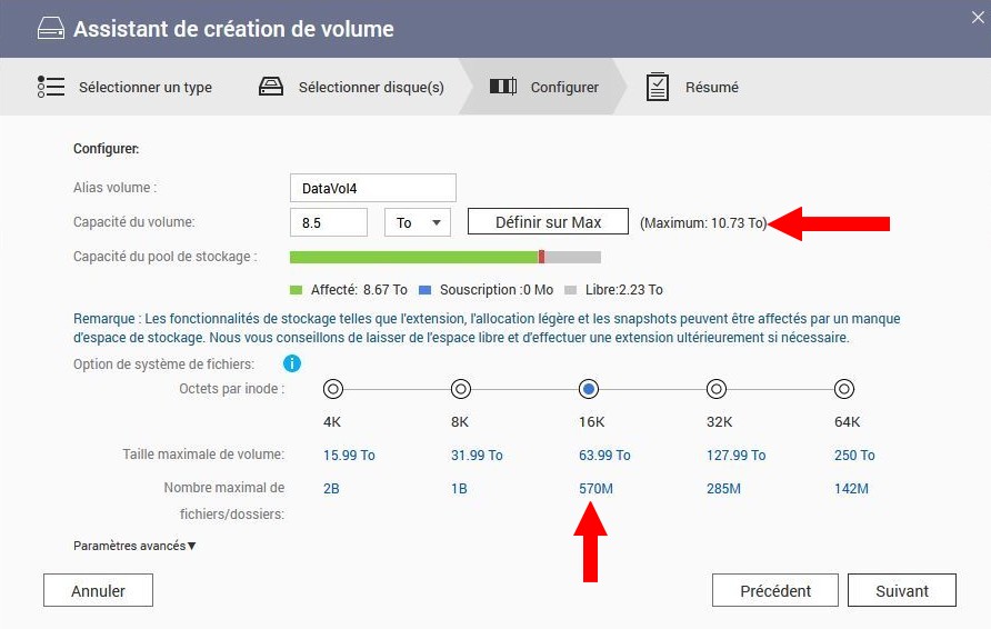 L’assistant suivant vous demande la taille du volume et les octets par inodes. Plus les octets sont gros, plus c’est rapide, mais plus il y a de place perdue pour de petits fichiers. J’ai suivi une conférence d’optimisation en ligne avec Qnap, et un des meilleurs rapport est 16 Koctets.
