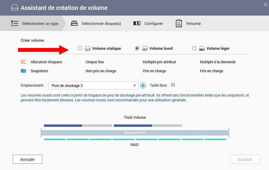 Ce qui amène à choisir le type de volume. thin ou thick (léger ou lourd), mais pour le cas, j’ai choisi le thick (volume lourd) où on définit "en dur" la place du volume et la place qu’il prend sur le pool de stockage. J’ai crée un volume unique, mais rien n’empêche d’en créer plusieurs, du moins sur le papier.