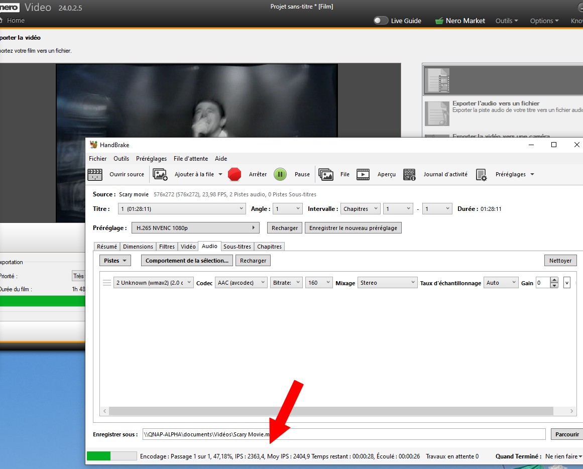 Cette théorie est confirmée en lançant du double encodage avec Nero d’un côté qui travaille à 80 % sur le CPU et handbrake sur le GPU. On assiste à des records de vitesse d’encodage à plus de 2300 IPS seconde avec handbrake.