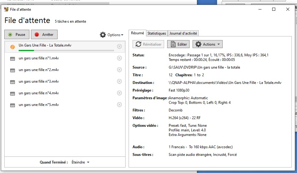 Quand vous lancez le traitement de la file depuis le bouton démarrer l’encodage ou à partir du menu file (à côté du bouton démarrer l’encodage, on arrive à ce genre de fenêtre :