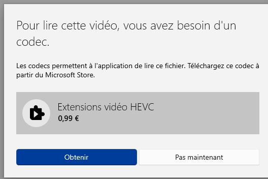 Notez que le lecteur windows 10 par défaut demande un plug-in payant (hevc - 0,99€ en octobre 2022 ) pour lire les vidéos h265 (HVEC), il suffit de payer selon Microsoft, mais je préfère changer le lecteur par défaut avec potplayer sous windows. (mxplayer sous android), que vous pourrez trouver sur le net à : POTPLAYER