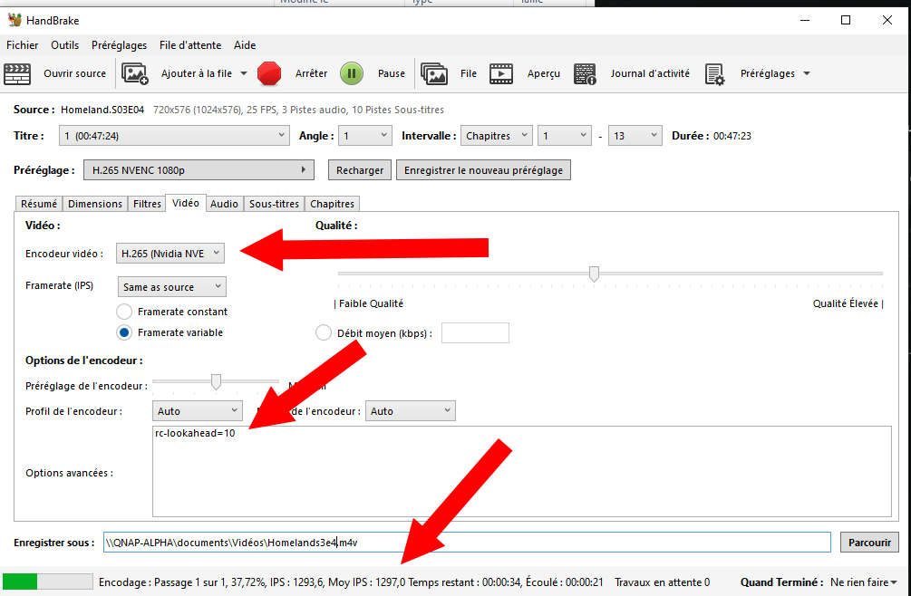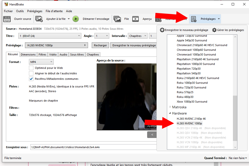 Dans préréglages, choisissez H265NVEC 1080p (ou l’option 4k le cas échéant, si vous encodez des films de blueray). Pour de l’encodage de série TV ou de films issus de DVD, je conserve le 1080p.