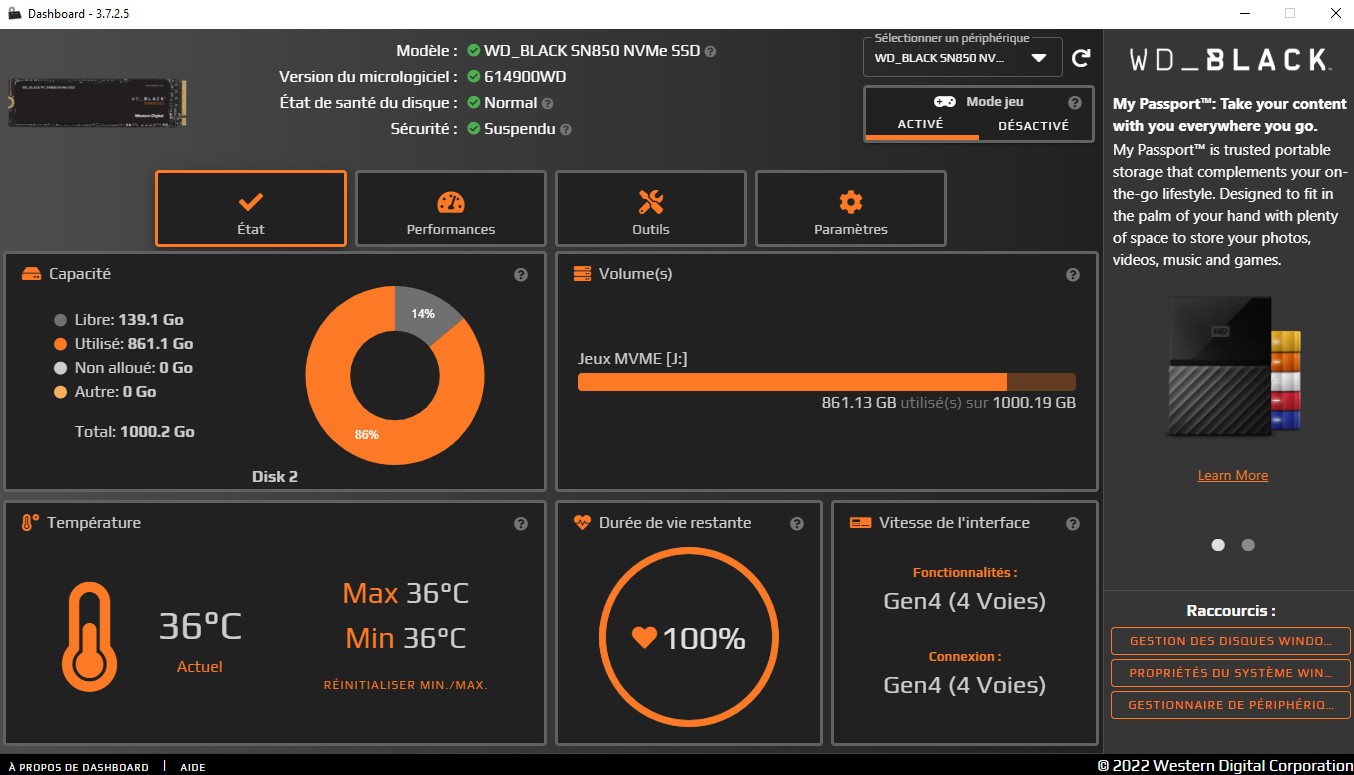 Sachez aussi que Western Digital dispose d’un logiciel de gestion de disques et de NVME : Dashboard, très utile pour superviser et gérer ce petit bazar, y compris les disques SATA... de marque Western Digital, naturellement.