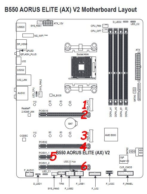 La carte mère étant une Gigabyte AORUS ELITE AX V2 (équipant pour la circonstance le pc polyvalent décrit dans un article de cette même rubrique), repérons sur la documentation les emplacements pouvant accueillir un ssd nvme, soit en natif, soit en s’équipant de matériel supplémentaire.