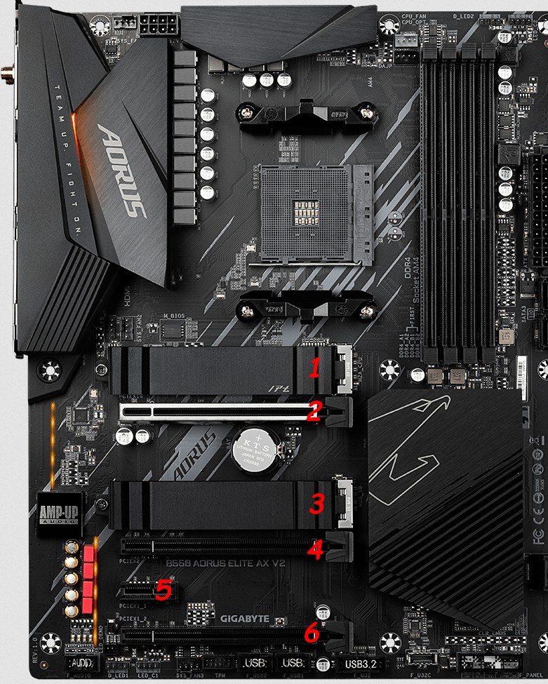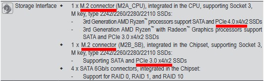 – Le premier emplacement NVME est PCIe 4.0 x4x2 (celui qui est près du processeur, sur notre carte emplacement 1)