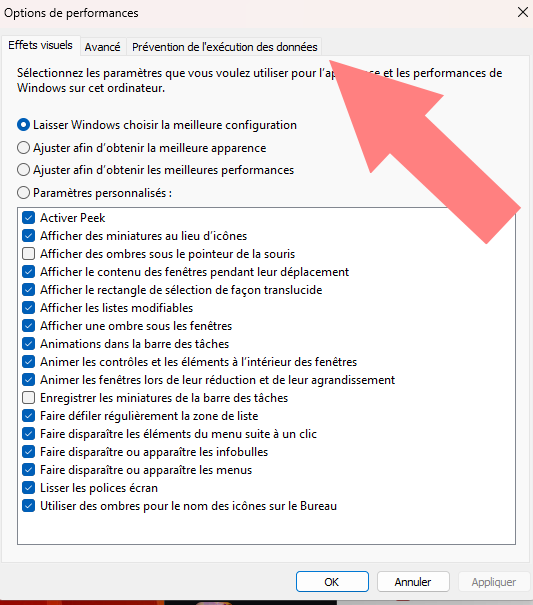 L’écran suivant s’affiche sur lequel il faut choisir, vous l’aurez deviné, "Prévention de l’exécution des données"