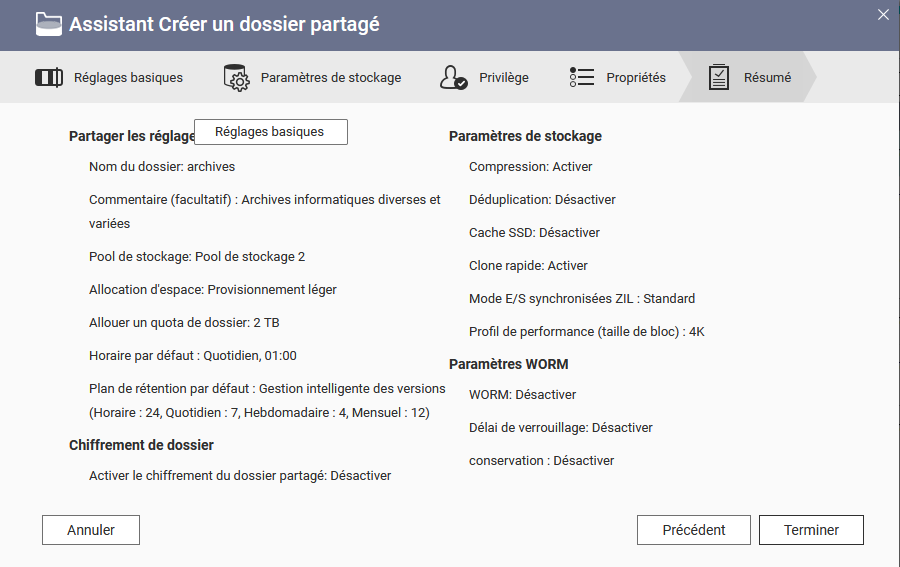 Enfin le dernier écran récapitulatif qui vous présente les options de dossier choisies.