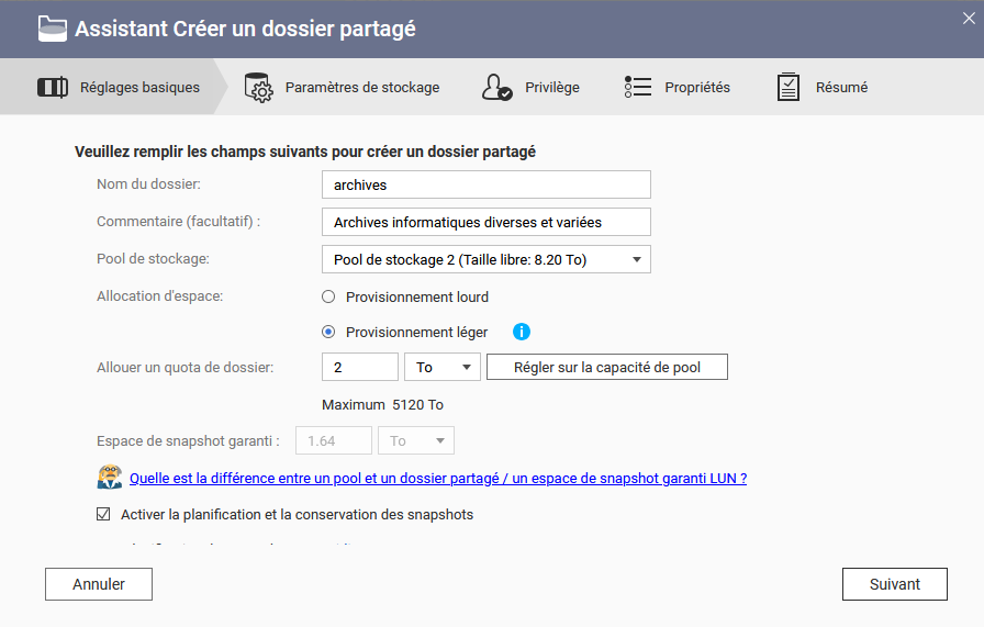 Il est toujours utile d’avoir ses prévisions de stockage en main lors de la création des dossiers partagés (qui seront donc, le cas échéant, des volumes de stockage).