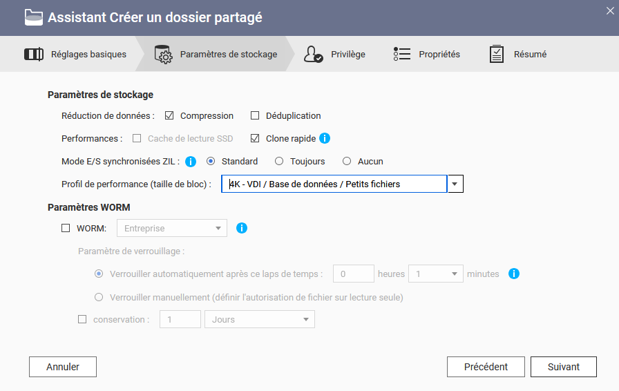 | exemple de Dossier partagé | Espace disque | Taille blocs | Type Stockage | Rythme E/S | Snapshot |