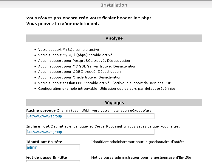 Header.inc.php existe maintenant à la racine de votre site egroupware, avec les bons paramètres. Nous pouvons donc continuer l’installation d’egroupware, à travers l’interface web...