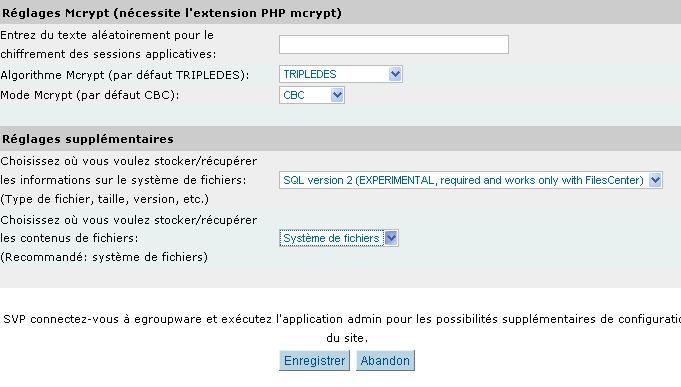 C’est une page importante, elle consiste à positionner tous les réglages système par défaut pour egroupware (sauvegardes, répertoires, etc ...) Egroupware a son propre système de réglage de fonctionnement préférentiel, mais cette partie se passera dans l’applicatif egroupware.