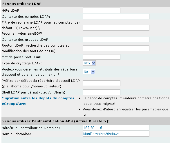 Pour la partie Ldap et active directory. Nous n’avons pas complété LDAP car nous pourrons le faire si nous décidons plus tard de laisser LDAP gérer les comptes et les groupes Egroupware. Par défaut, les comptes et les groupes d’egroupware sont gérés par défaut par egroupware.